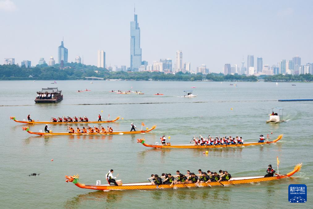 5月24日,龙舟队伍在南京玄武湖上竞逐(无人机照片)。