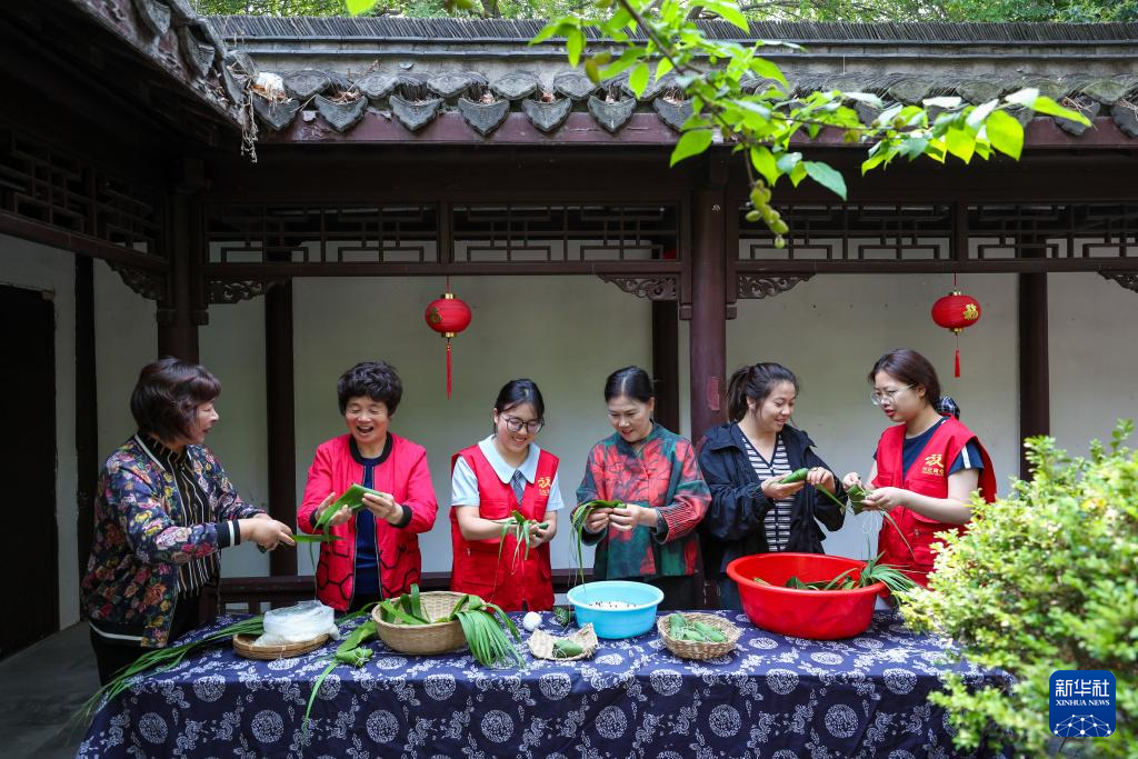 5月24日,在位于江苏省兴化市昭阳街道的兴化书院,青年志愿者和社区居民一起包粽子。