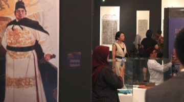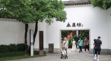 7月14日,游客在大汶口遗址博物馆内参观出土陶器。
