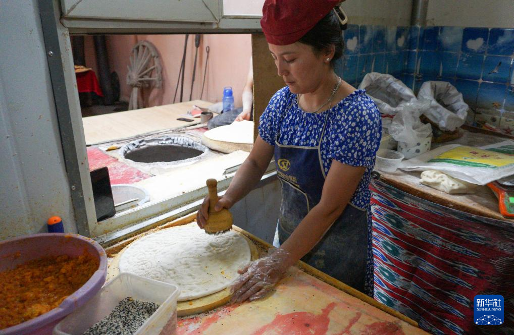 7月22日,在新疆库车市,热西提往馕坯上撒放香料。