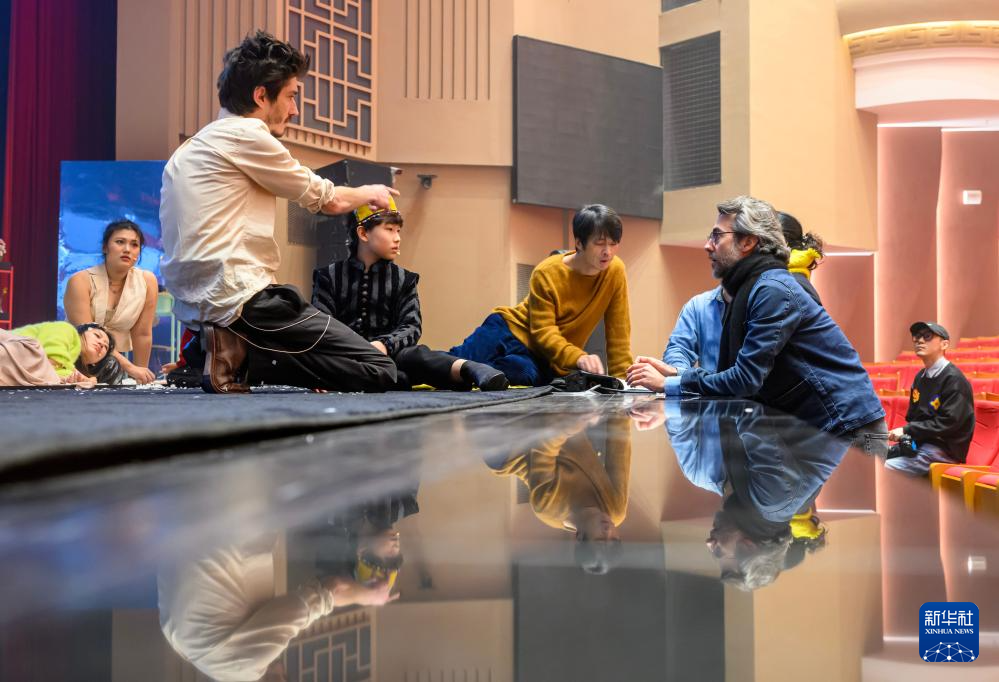 11月14日,导演让·贝洛里尼(前右)指导演员排练。