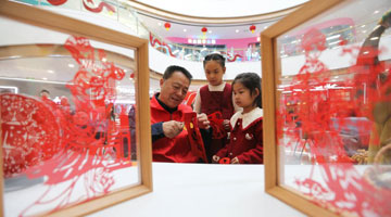2月4日,在天津杨柳青画社,画师为年画调色。