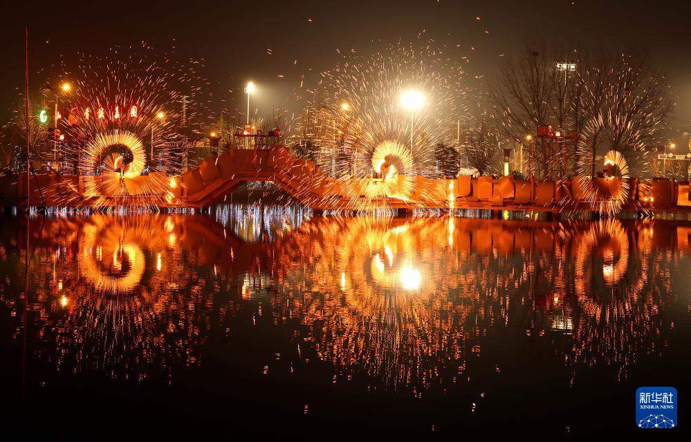 2月10日在山东省枣庄市中兴国家矿山公园拍摄的非遗“打铁花”表演。