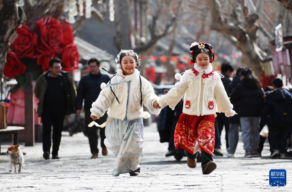 2月10日,小朋友在河南省许昌市襄城县明清古街游玩。