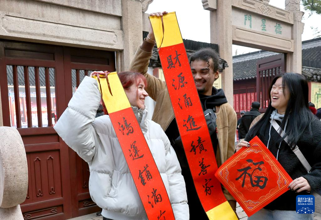 2月12日,来自法国的留学生麦可莱(左一)和朋友一起展示春联。