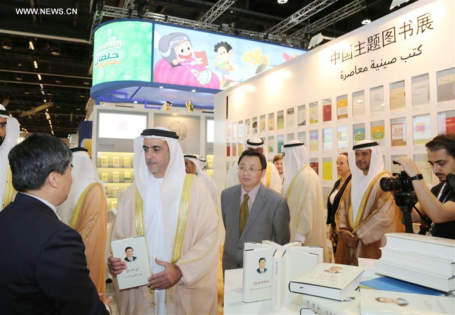 Sheikh Saif bin Zayed Al-Nahyan (2nd L), deputy prime minister and interior minister the United Arab Emirates (UAE), views the Arabic edition of Chinese President Xi Jinping's book "Xi Jinping: The Governance of China" at the 27th Abu Dhabi International Book Fair in Abu Dhabi April 26, 2017. (Xinhua/Li Zhen)