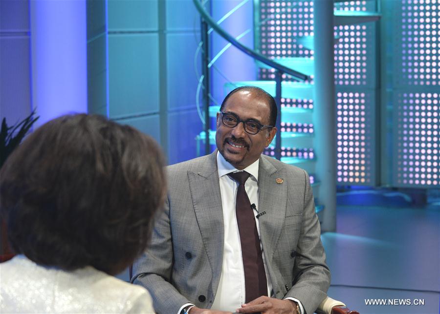 UN Under Secretary General and Executive Director of UNAIDS Michel Sidibe receives an interview with Xinhua News Agency on China's Belt and Road Initiative in Beijing, capital of China, May 12, 2017. (Xinhua/Wang Huajuan)