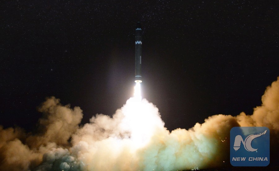 Photo provided by Korean Central News Agency (KCNA) on Nov. 30, 2017 shows the test-firing of an Intercontinental Ballistic Missile on Nov. 29, 2017. The Democratic People's Republic of Korea (DPRK) successfully test-fired a newly developed Intercontinental Ballistic Missile (ICBM), the country's Korean Central Television reported. (Xinhua/KCNA)