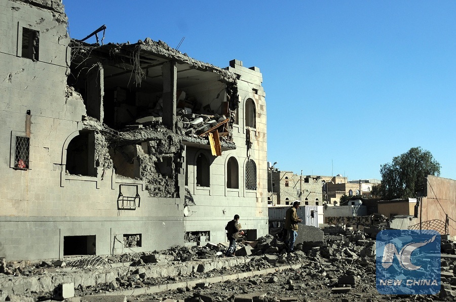 People inspect the site of airstrikes in Sanaa, Yemen, Dec. 13, 2017. (Xinhua/Mohammed Mohammed)
