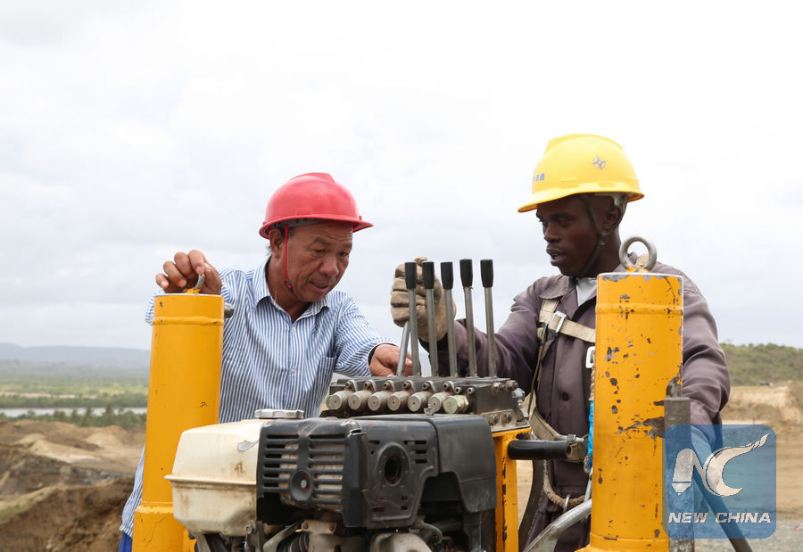 File photo show a Chinese engineer working with his Kenyan colleague at the Mombasa super bridge of the Standard gauge railway (SGR) project, in Mombasa, Kenya, on Sept. 1, 2016. (Xinhua/Pan Siwei)