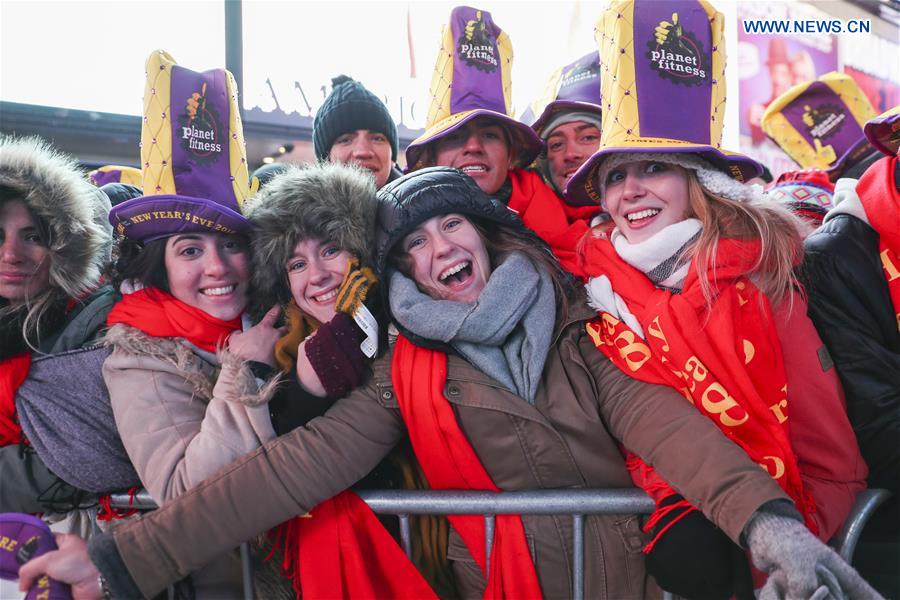 People wait for the New Year celebration at Times Square in New York, the United States, on Dec. 31, 2017. (Xinhua/Wang Ying)