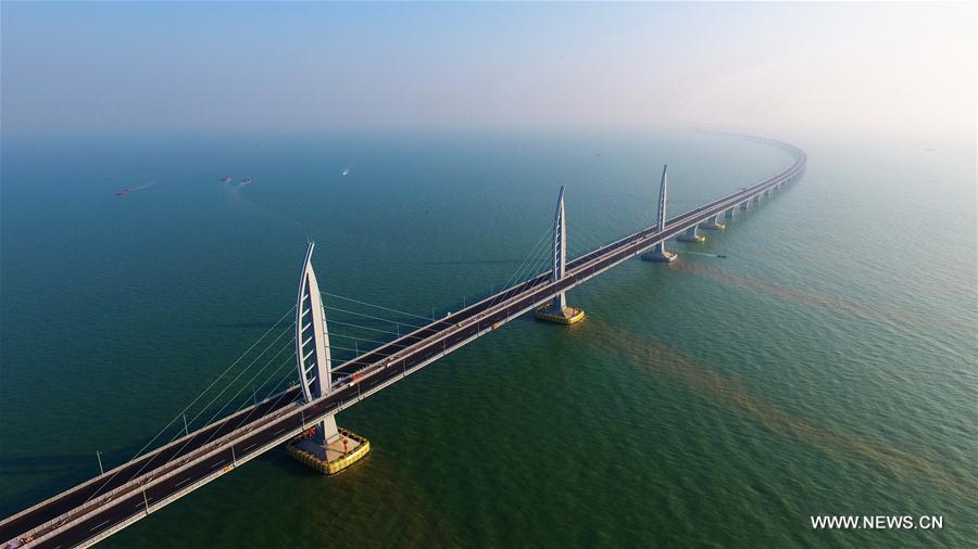 Aerial photo taken on Dec. 27, 2017 shows the Hong Kong-Zhuhai-Macao Bridge in early morning, south China's Guangdong Province. The major work of the world's longest sea bridge was completed on Dec. 31, 2017 as scheduled, after its lighting system was installed and tested. It took six years preparation, and eight years to build the 55-kilometer-long bridge linking Hong Kong, Zhuhai and Macao. The bridge will slash travel time between Hong Kong and Zhuhai from three hours to just 30 minutes, further integrating cities in the Pearl River Delta. (Xinhua/Liang Xu)