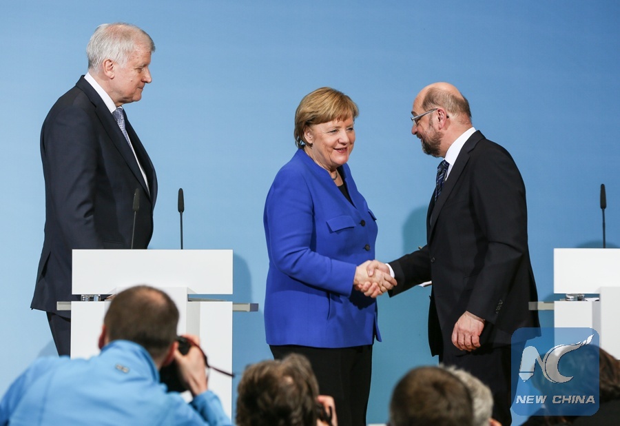 BERLIN, Jan. 12 (Xinhua) -- The exploratory talks for German government coalition reached breakthrough on Friday, which will probably end the political uncertainty in Berlin and give strong support to European Union through closer cooperation with France.