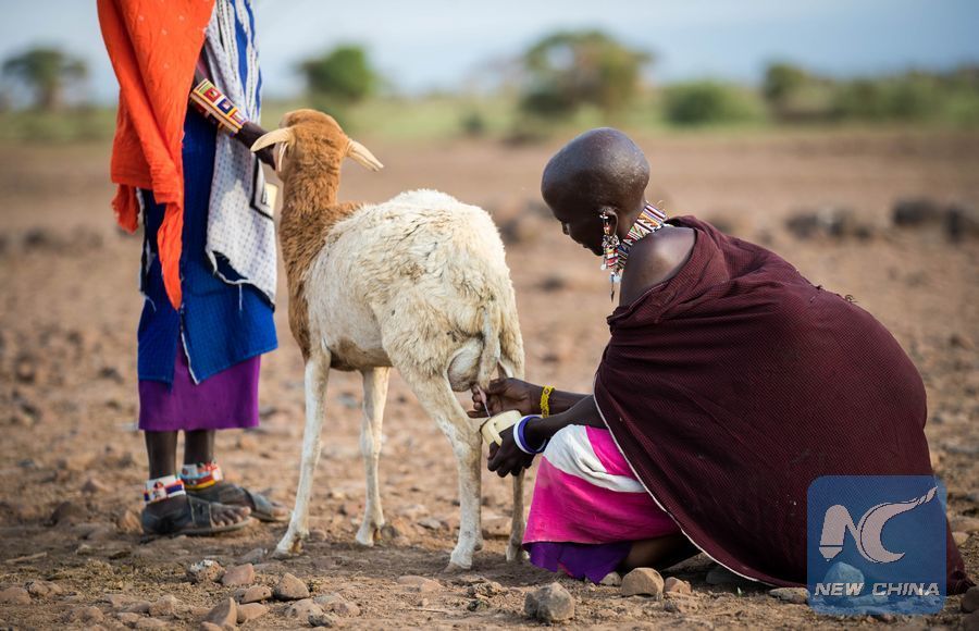 A Masai woman milks a sheep at a Masai village in Amboseli National Park, Kenya, Jan. 9, 2018. (Xinhua/Lyu Shuai)