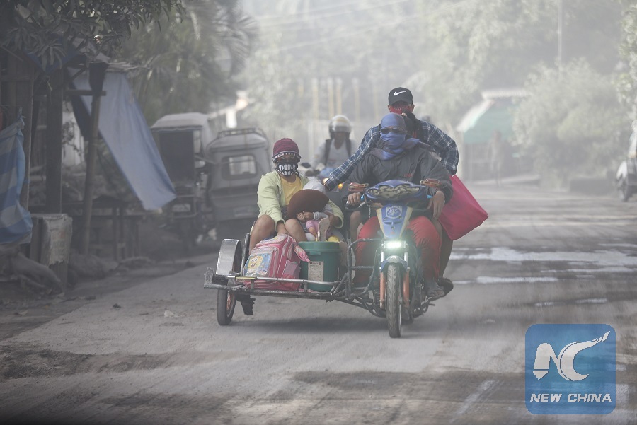 Residents evacuate from their home after a giant ash cloud was spewed from Mayon volcano in Albay Province, the Philippines, Jan. 22, 2018. (Xinhua/Stringer)