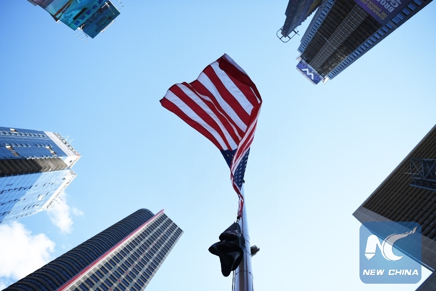 File Photo: A U.S. national flag flies at half mast to mourn the victims of a mass shooting in Las Vegas, at Times Square in New York City, the United States, on Oct. 3, 2017. (Xinhua/Li Rui)