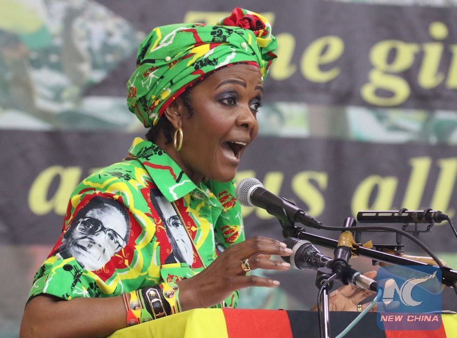 File photo of former Zimbabwean First Lady Grace Mugabe addressing a meeting in Harare, Zimbabwe, July 27, 2017. (Xinhua/Stringer)