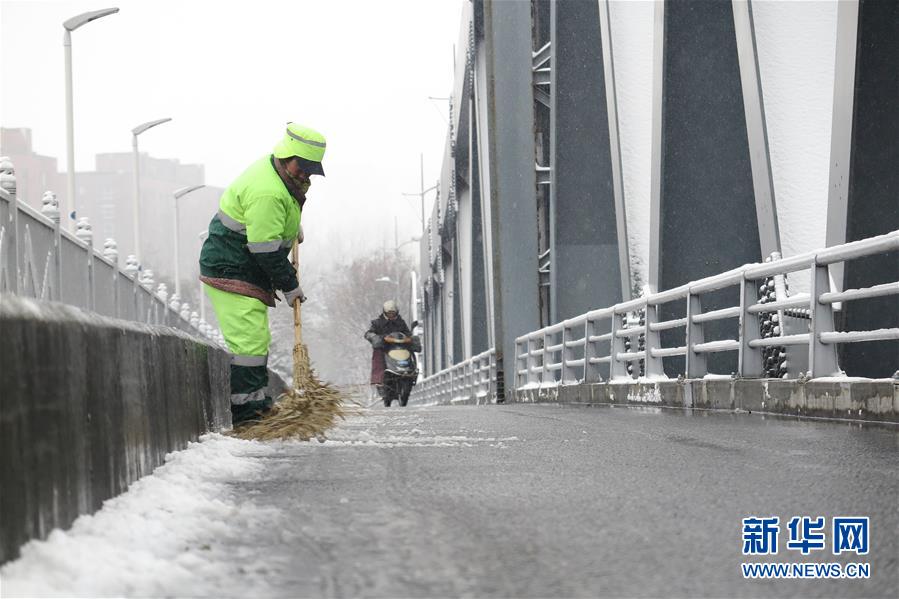 A sanitation worker clears snow from the roads in Wuxi City, east China’s Jiangsu Province, Jan. 25, 2018. (Xinhua/Tang Yi)