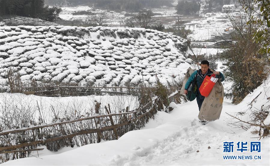 Postman Gu Mingzhou walks along a mountain path, carrying on his shoulders mails to be delivered to local people in Jinzhai County, east China’s Anhui Province, Jan 26, 2018. (Xinhua/Chen Li)