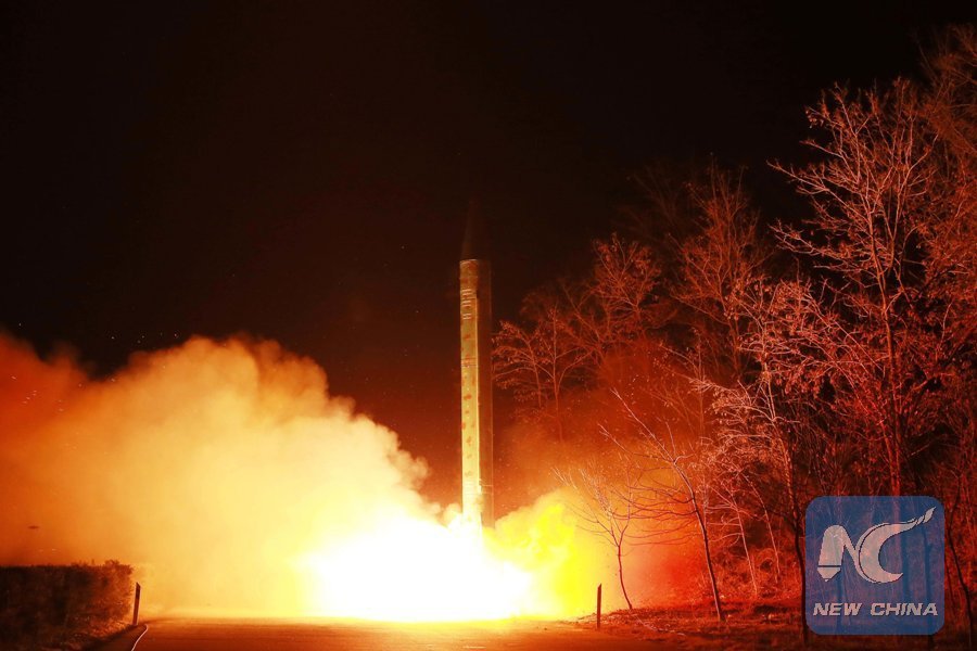 Photo provided by Korean Central News Agency (KCNA) on March 11, 2016 shows a scene of a ballistic rocket launch drill of the Strategic Force of the Korean People's Army (KPA). (Xinhua/KCNA)