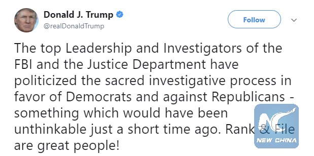 "The top Leadership and Investigators of the FBI and the Justice Department have politicized the sacred investigative process in favor of Democrats and against Republicans - something which would have been unthinkable just a short time ago," Trump tweeted Friday morning.