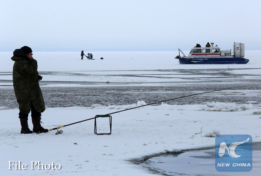 Fishermen are engaged in ice fishing on ice of the Gulf of Finland on February 7, 2015. (Xinhua/SIPA)