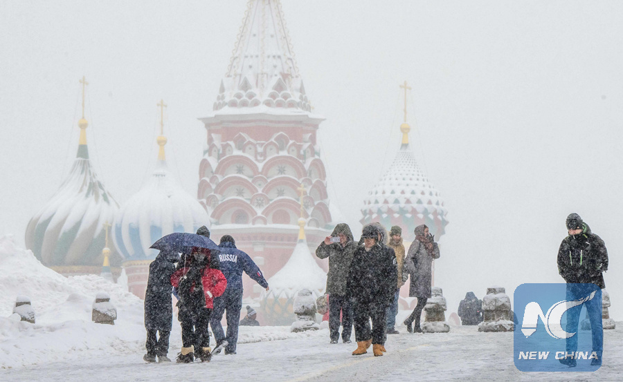 People walk on the snow covered Red Square in front of Saint Basil's Cathedral during a heavy snowfall in Moscow on January 31, 2018. (AFP PHOTO)