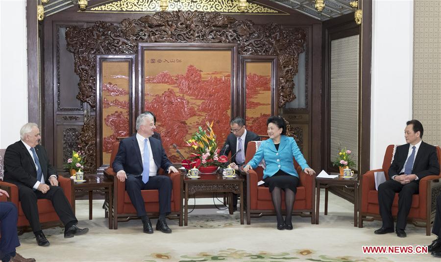 Chinese Vice Premier Liu Yandong (2nd R, front) meets with Hungarian Deputy Prime Minister Zsolt Semjen (2nd L) and Deputy Speaker of the Hungarian Parliament Janos Latorcai in Beijing, capital of China, Feb. 5, 2018. (Xinhua/Ding Haitao)