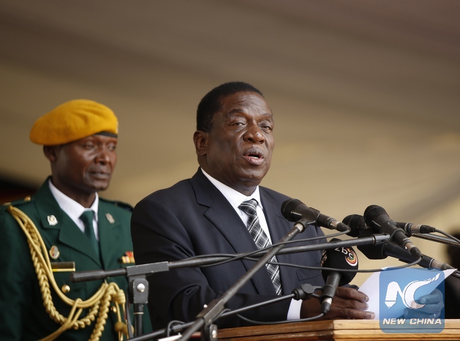 Zimbabwean President Emmerson Mnangagwa (Front) speaks during a ceremony to rename the country's army and air force headquarters, in Harare, capital of Zimbabwe, Dec. 6, 2017. (Xinhua/Shaun Jusa)