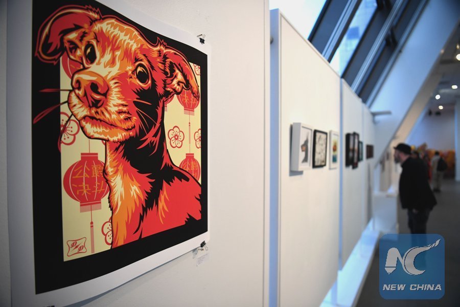 People visit an exhibition at Chinese Culture Center of San Francisco in San Francisco, the United States, on Feb. 22, 2018. Chinese Culture Center of San Francisco celebrated Chinese New Year of the Dog with a dog-themed artwork exhibition. (Xinhua/Wu Xiaoling)