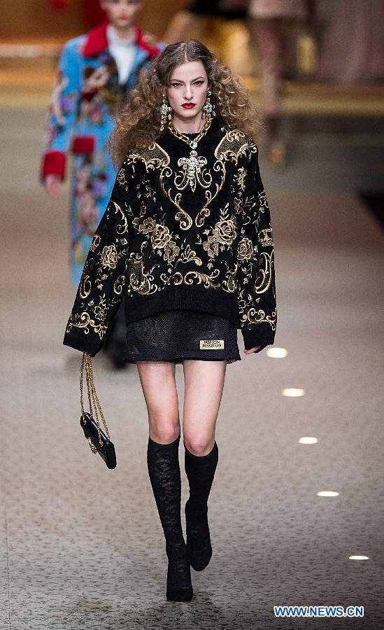 A model presents a creation of Dolce&Gabbana "Fashion Devotion" Autumn/Winter?18/19 women's collection during Milan Fashion Week in Milan, Italy, Feb. 25, 2018. (Xinhua/Jin Yu)
