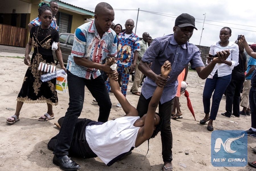 A relative, carried by two men, reacts and mourns the death of a man who succumbed to a gun shot wound during a protest to push for the president of the Democratic Republic of Congo to step down on Feb. 25, 2018 in Kinshasa. (Xinhua/AFP)