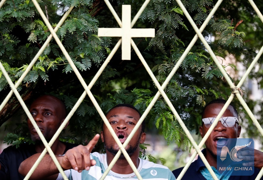 Protesters shout at police from Notre Dame Cathedral compound in Kinshasa, Democratic Republic of Congo, Feb. 25, 2018. (Xinhua/REUTERS)
