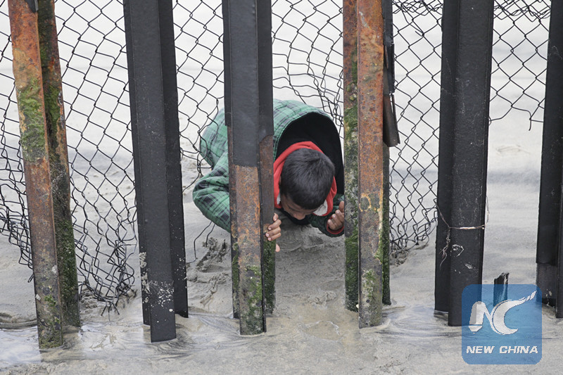 A boy tries to squeeze through the border fence in Playas de Tijuana, Mexico, in this Feb. 6, 2017 file photo. When other countries are building bridges to facilitate transportation and communication, the United States, to the contrary, is building a wall that purports to prevent migrants from entering the country but will end up isolating itself from the world. (Xinhua/Dan Hang)