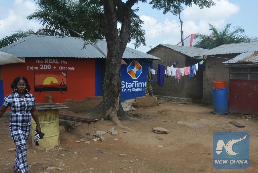 A woman walks past the poster of StarTimes in Hulumi community in the Nigerian capital of Abuja, on Aug. 10, 2017. StarTimes, a Chinese firm which offers direct-to-home pay TV services, introduced its digital TV service to the locality as part of its pilot project to provide satellite TV in five Nigerian villages. The project is a fruit of one of the resolutions of the 2015 summit of Forum On China-Africa Cooperation, in Johannesburg, South Africa, in which the Chinese government pledged to provide satellite TV in 10,000 African villages. (Xinhua/Zhang Baoping)