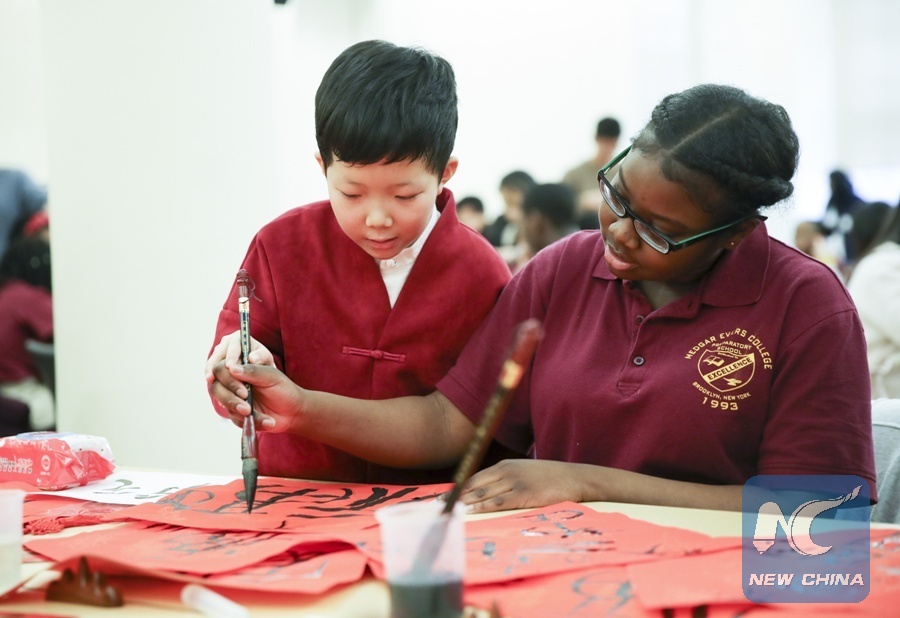 A student from Beijing teaches a student from Medgar Evers College Preparatory School of New York how to write Chinese calligraphy during a cultural exchange event in New York, the United States, Feb. 2, 2018. (Xinhua/Wang Ying)