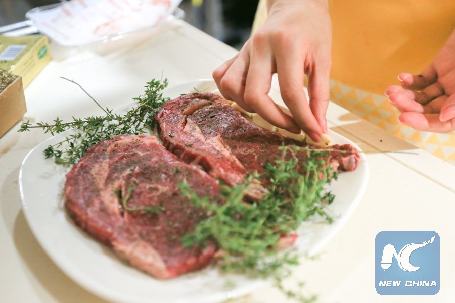 Photo taken on Nov. 2, 2017 shows a local resident marinating beef imported from the United States, in Shanghai, east China. (Xinhua/Meng Dingbo)