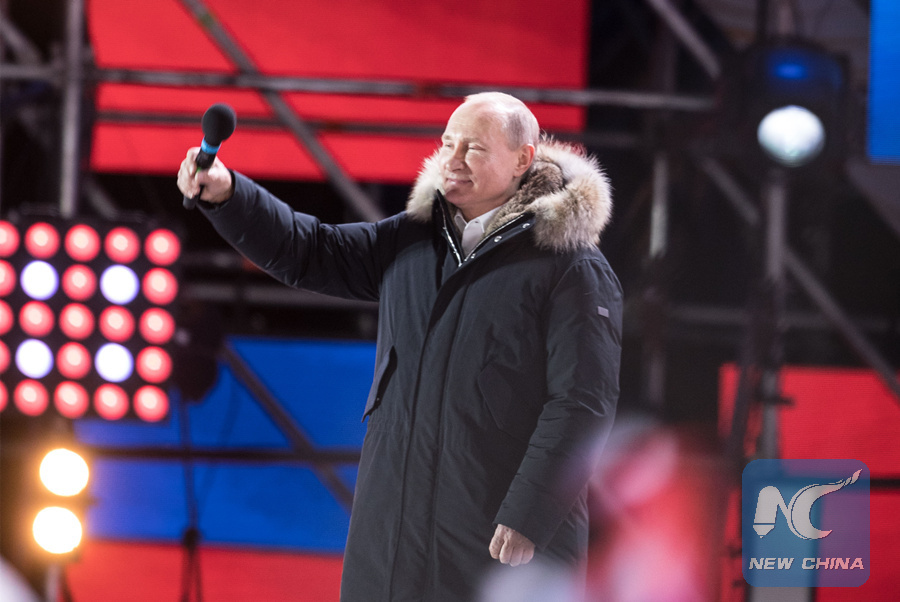 Russian President Vladimir Putin gestures to people at a rally outside Red Square in downtown Moscow on March 18, 2018. (Xinhua/Wu Zhuang)