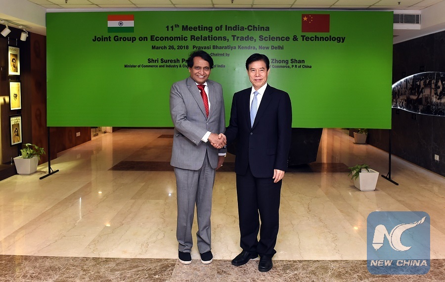 Chinese Commerce Minister Zhong Shan (R) shake hands with Indian Commerce and Industry Minister Suresh Prabhu on March 26, 2018. (Xinhua/Zhang Naijie)