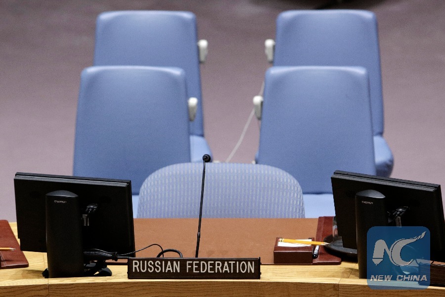 Photo taken on March 26, 2018 shows empty seats for the Russian delegation in the United Nations Security Council chamber after an UN Security Council meeting on the situation in the Middle East at the UN headquarters in New York. The UN Secretariat has received the U.S. decision to expel 12 diplomats of the Russian mission to the world body, said a UN spokesman on Monday. (Xinhua/Li Muzi)