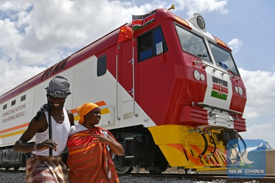Kenyans sing and dance beside one of the first batch of locomotives that were made by Chinese companies for the Mombasa-Nairobi Standard Gauge Railway, in Mombasa, Kenya, on Jan. 11, 2017. (Xinhua/Sun Ruibo)