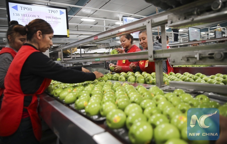 Workers put granny smith apples into trays on a packing line at a packing house of Auvil Fruit Company in Wenatchee, Washington State, the United States, on Nov. 3, 2017. China has become one of Auvil's biggest overseas markets for its apples and cherries in recent years since the company learned about the B2C platform Tmall. (Xinhua/Wang Ying)