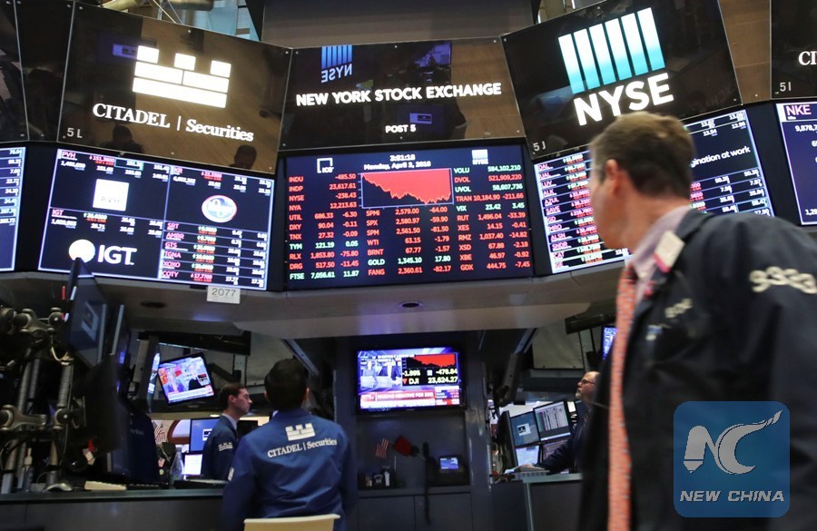 The Dow Jones Industrial Average loses 458.92 points, or 1.90 percent, to 23,644.19 on April 2, 2018, the first trading day in April, as worries about trade issues and a sharp decline in the technology sector weigh on the market. (Xinhua/ Wang Ying)