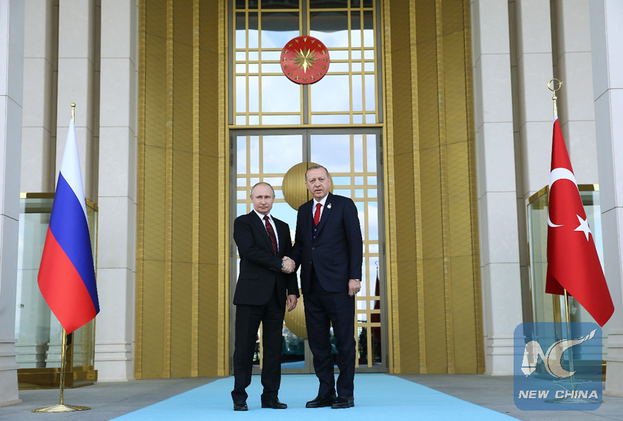 Turkish President Recep Tayyip Erdogan welcomes his Russian counterpart Vladimir Putin at the Presidential Palace in Ankara, Turkey, on April 3, 2018. (Xinhua/Turkish Presidential Palace)