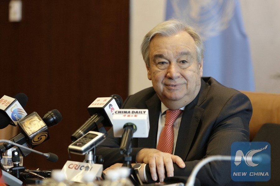 United Nations Secretary-General Antonio Guterres speaks during a joint interview with the Chinese media at the UN headquarters in New York, April 5, 2018. (Xinhua/Li Muzi)