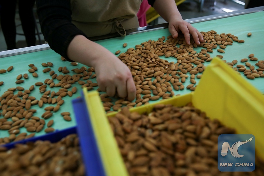Rosa Martinez sorts and removes imperfect almonds at Capay Canyon Ranch in Esparto, California, U.S. April 2, 2018. (Xinhua/REUTERS)