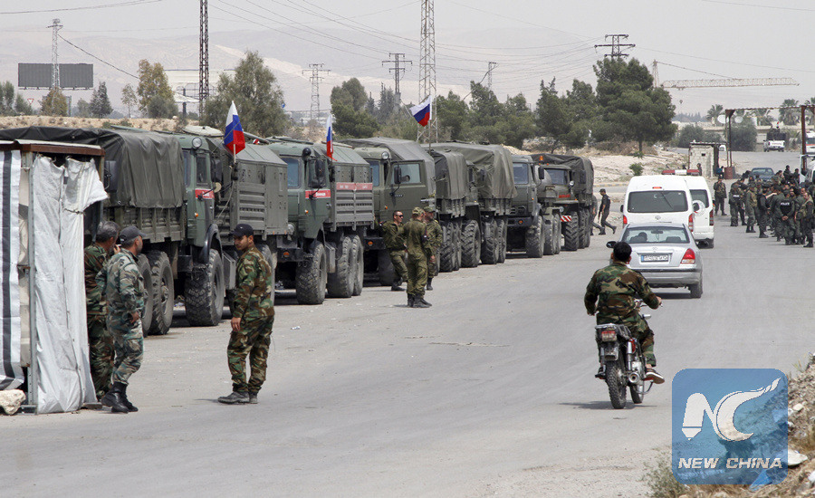 Russian military police forces are seen at the Wafideen area near the town of Douma, on the northeast of Damascus, Syria, on April 12, 2018. (Xinhua/Monsef Memeri)