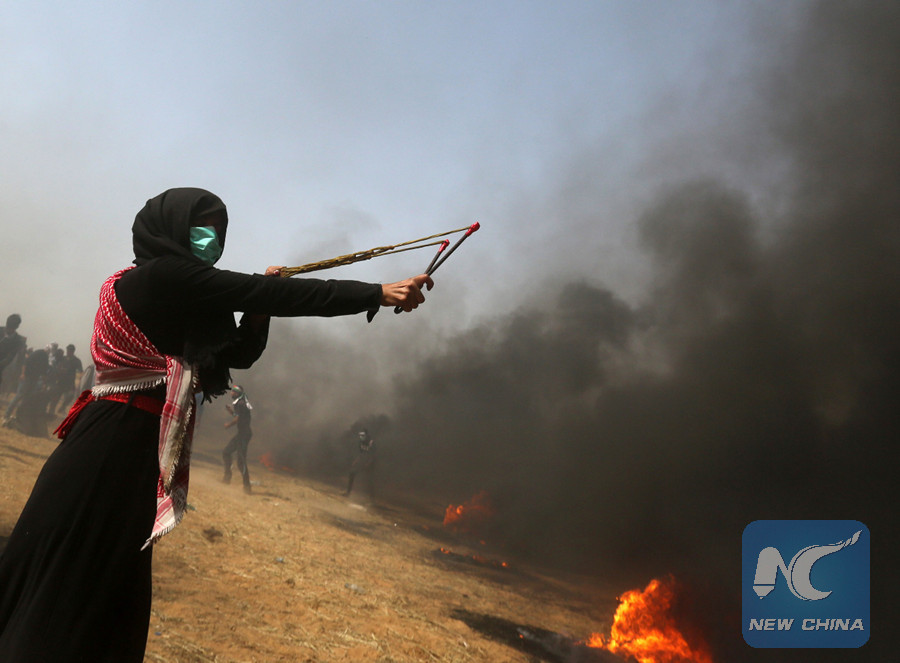 A Palestinian woman uses slingshot to hurls stones at Israeli troops during clashes on the Gaza-Israel border, east of Khan Younis in the southern Gaza Strip on Apr. 13, 2018. (Xinhua/Yasser Qudih)