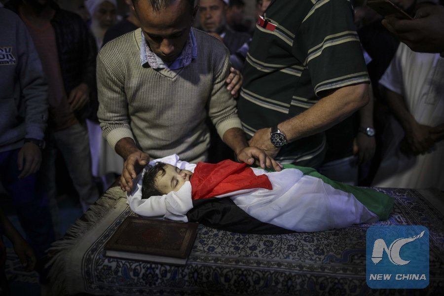 Mourners and relatives attend the funeral of of eight-month-old Palestinian infant Laila al-Ghandour, who died after inhaling tear gas during a protest at the Israel-Gaza border in Gaza City, on May 15, 2018. On Monday, Israeli forces shot dead dozens of Palestinians and injured more than 2,000 others in a day-long confrontation along the Gaza strip-Israel border. (Xinhua/Wissam Nassar)
