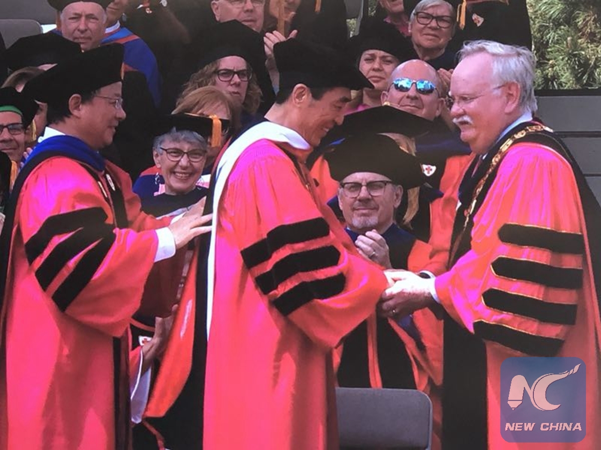 Chinese filmmaker Zhang Yimou (C) received an honorary Doctor of Humanize Letters from the Boston University at its 145th Commencement on May 20, 2018. (Xinhua Photo/Dong Ding)